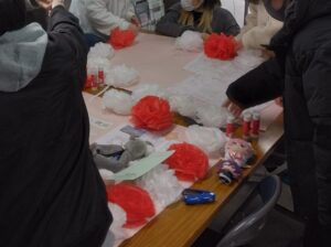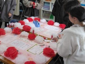 < 今日はいただいたお祝いの言葉を模造紙に貼り付けたりお花を作りました♪