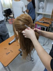アルファジャパン美容専門学校から講師の先生をお招きし、メイクとヘアアレンジの体験をしました。